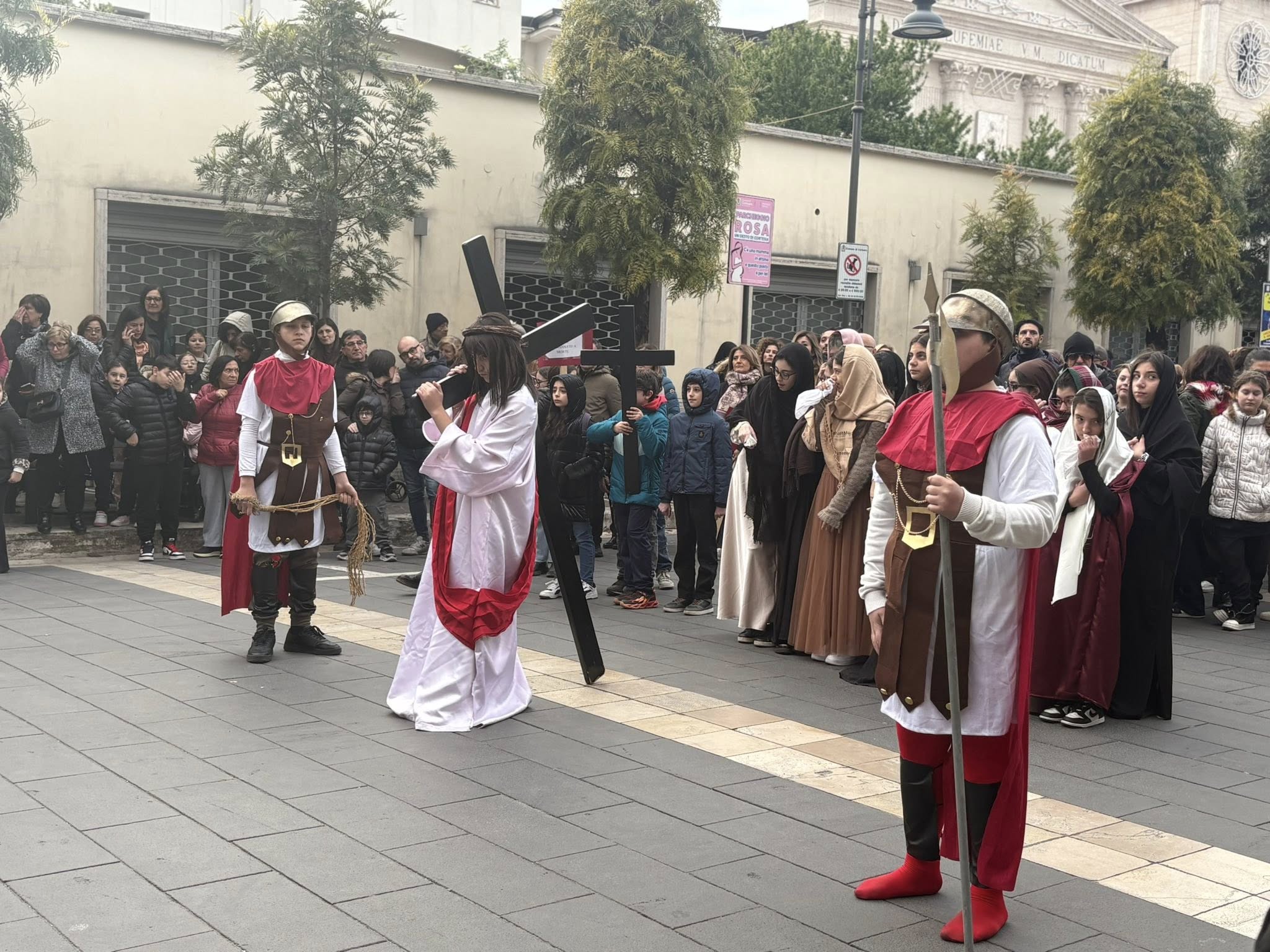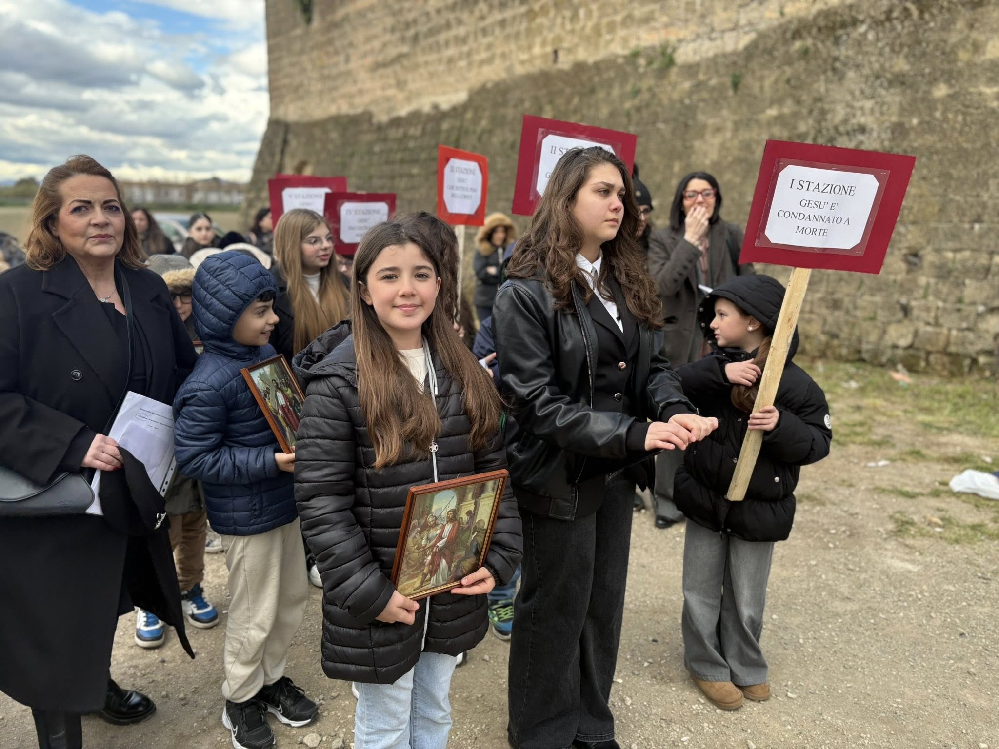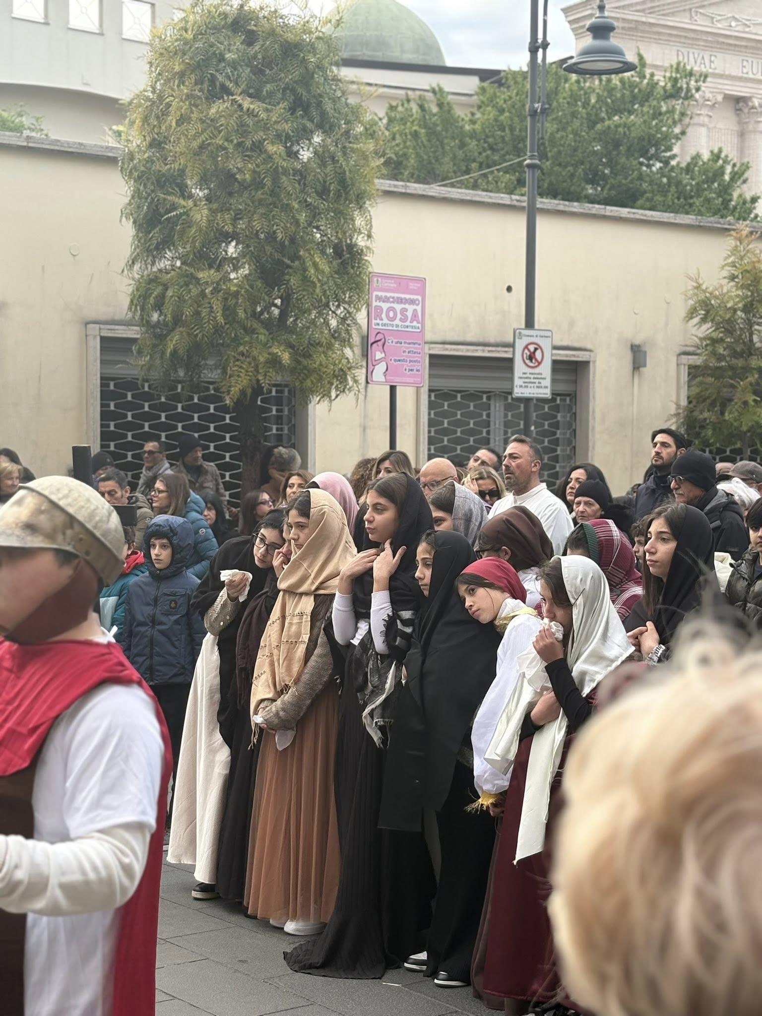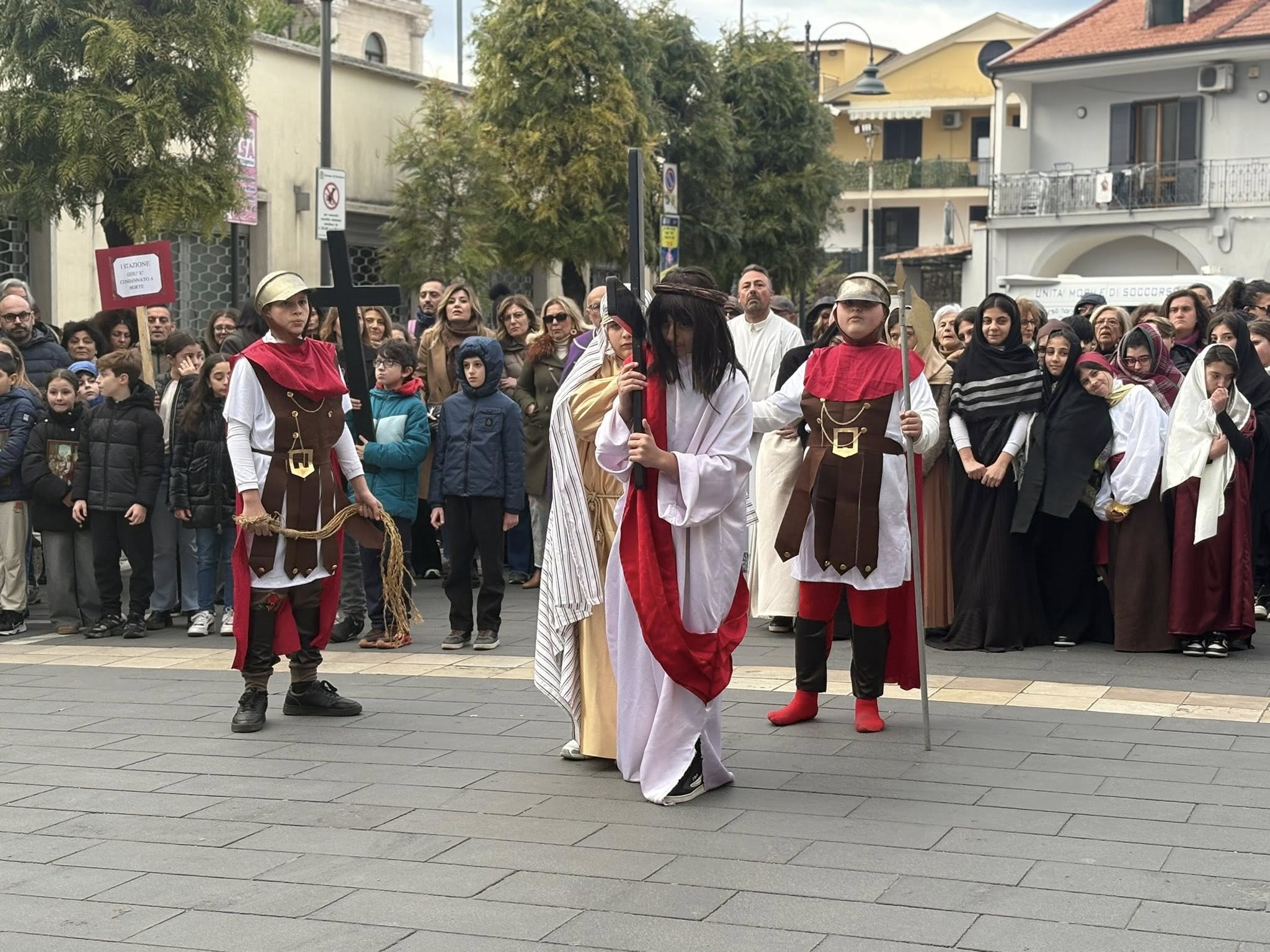 Il percorso con studenti e famiglie – A rendere particolarmente significativa la rappresentazione sono stati gli studenti, veri protagonisti dell’evento. I ragazzi hanno interpretato le diverse stazioni, indossando abiti d’epoca e dando vita ai momenti della Passione di Cristo. Un impegno sostenuto anche dalle famiglie che, insieme ai docenti, hanno contribuito in modo determinante alla riuscita delle rappresentazioni. La Via Crucis è partita dall’area campestre del Palazzo di Casignano, attraversando via Piave fino a raggiungere piazza Trieste. Un cammino condiviso da alunni, insegnanti e cittadini che ha coinvolto l’intera comunità. Al termine, è stato offerto un dono pasquale a tutti gli alunni presenti.