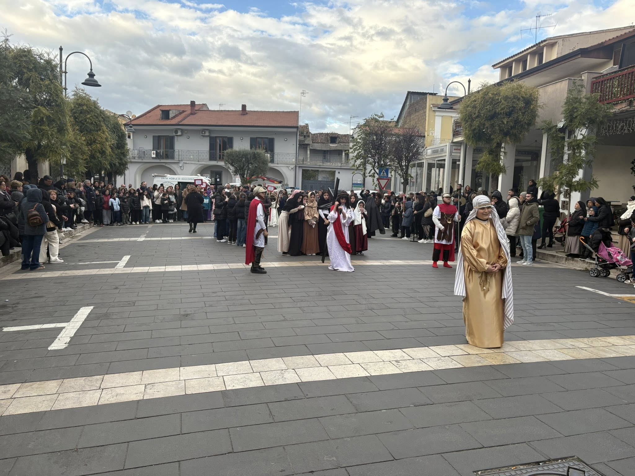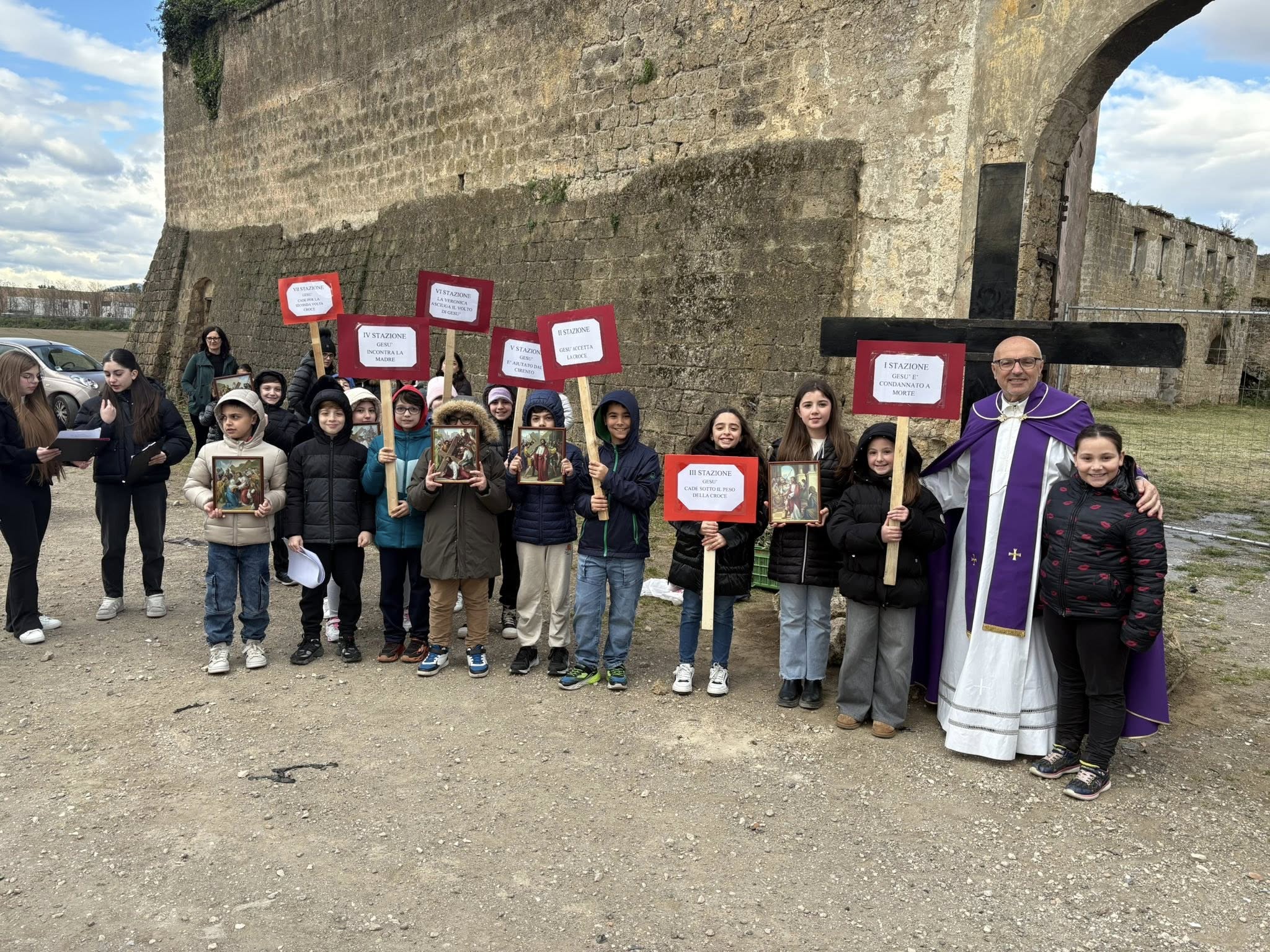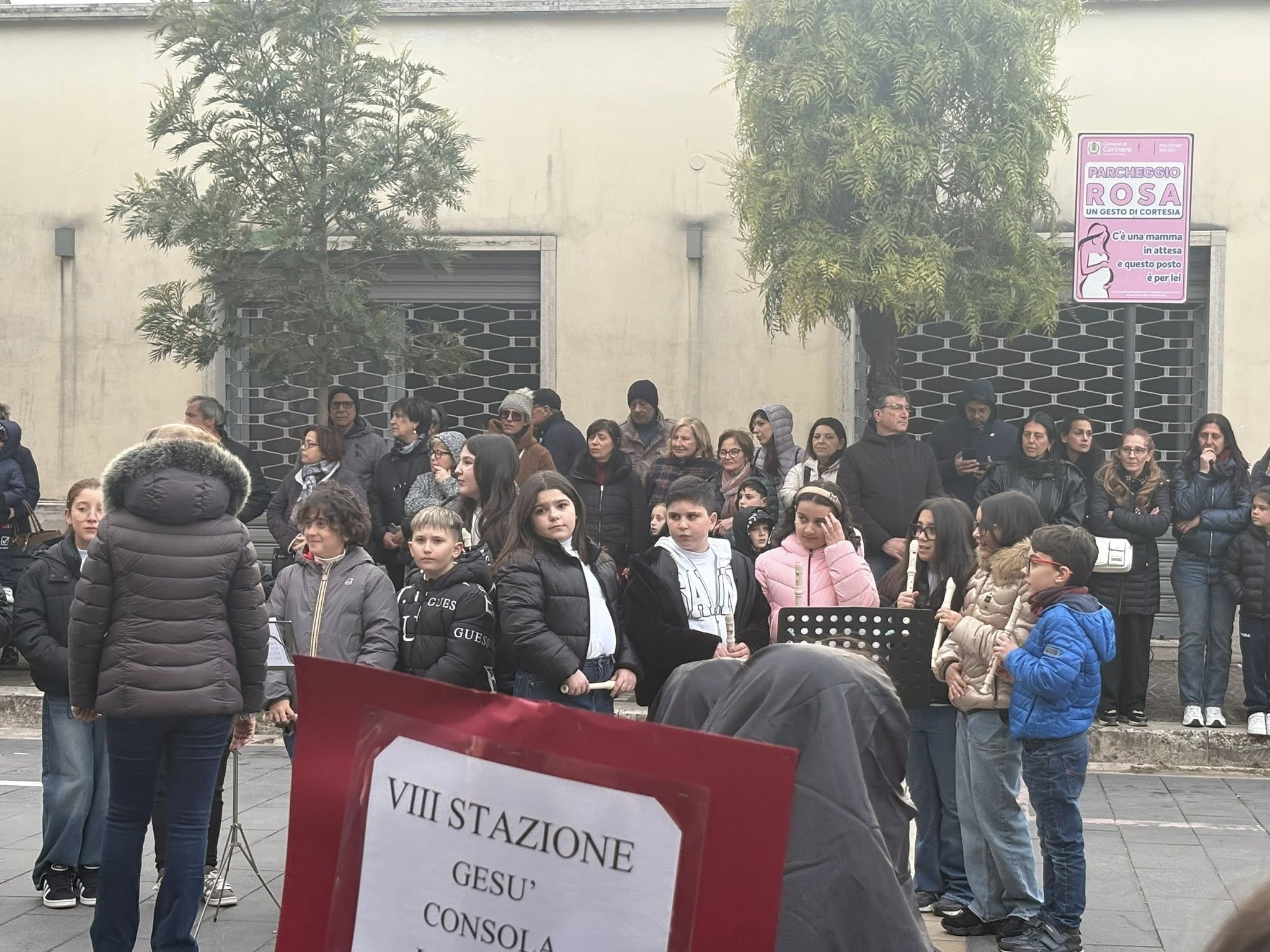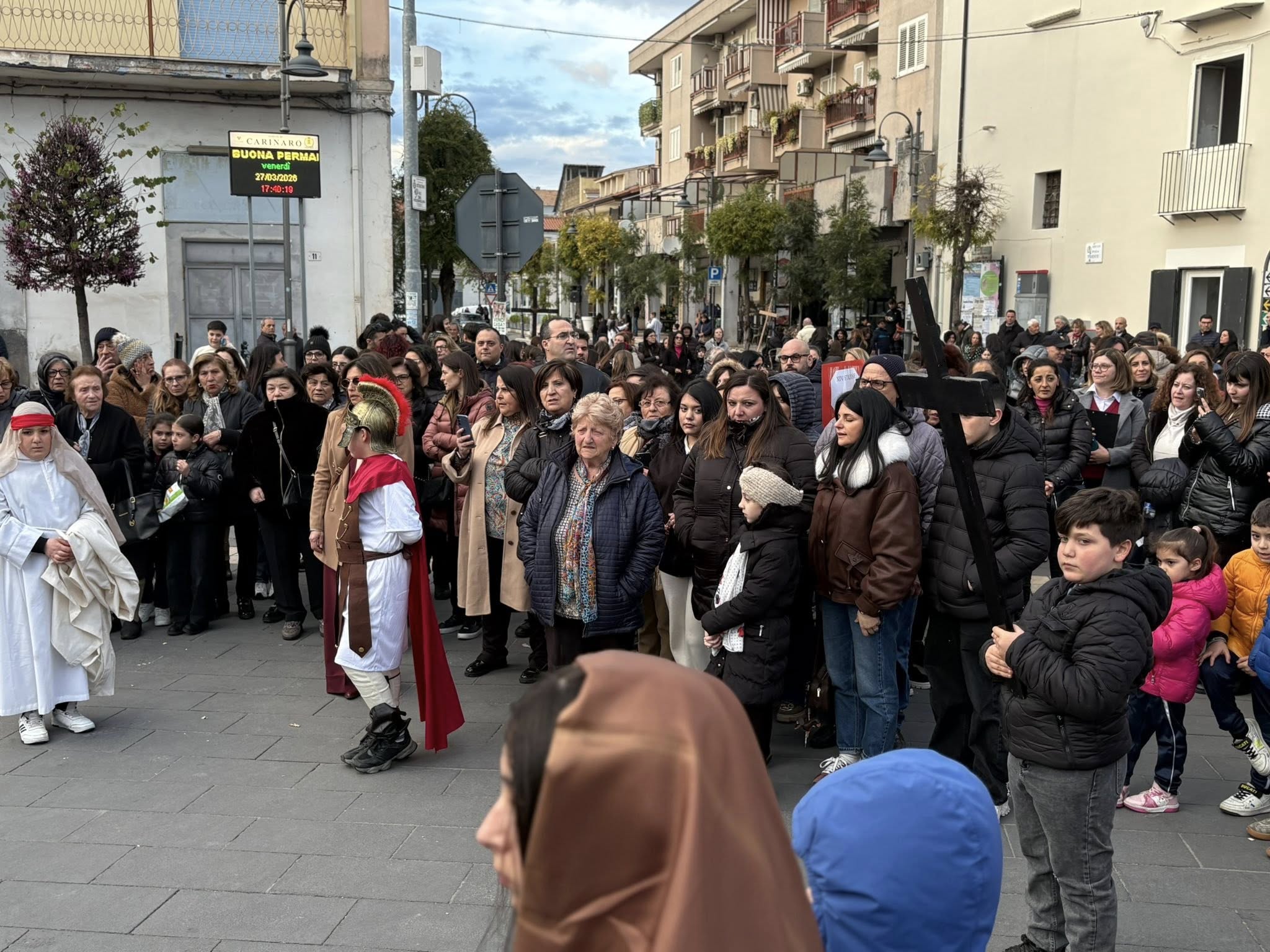 Il percorso con studenti e famiglie – A rendere particolarmente significativa la rappresentazione sono stati gli studenti, veri protagonisti dell’evento. I ragazzi hanno interpretato le diverse stazioni, indossando abiti d’epoca e dando vita ai momenti della Passione di Cristo. Un impegno sostenuto anche dalle famiglie che, insieme ai docenti, hanno contribuito in modo determinante alla riuscita delle rappresentazioni. La Via Crucis è partita dall’area campestre del Palazzo di Casignano, attraversando via Piave fino a raggiungere piazza Trieste. Un cammino condiviso da alunni, insegnanti e cittadini che ha coinvolto l’intera comunità. Al termine, è stato offerto un dono pasquale a tutti gli alunni presenti.