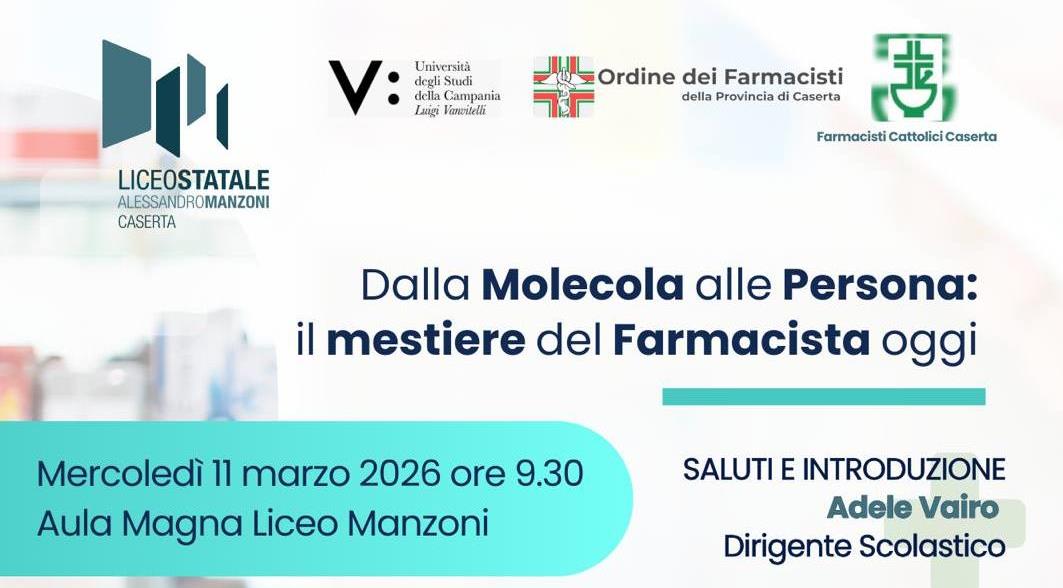Caserta – Un percorso di approfondimento dedicato alla figura del farmacista, oggi sempre più punto di riferimento sanitario per i cittadini. È questo il tema della mattinata di studi in programma mercoledì 11 marzo, dalle 9.30, al Liceo “Manzoni”, appuntamento pensato per offrire agli studenti uno sguardo ampio sulle prospettive universitarie e professionali del settore farmaceutico.