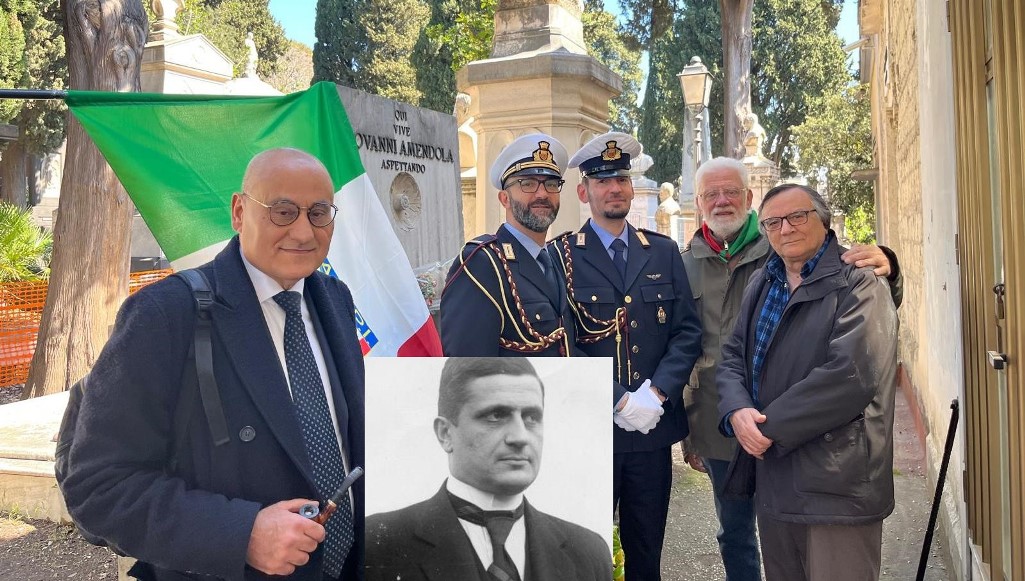 La commemorazione – Nella mattinata del 7 aprile, davanti alla tomba dove le spoglie dello statista furono trasferite dalla Francia il 7 aprile 1950, si sono riuniti rappresentanti istituzionali e associazioni. Presenti l’assessore alla Salute e al Verde del Comune di Napoli, Vincenzo Santagada, due agenti di Polizia Municipale in alta uniforme con la corona di fiori, un rappresentante del Comune di Sarno – città natale del padre di Amendola – e i nipoti, figli di Pietro, tra cui Giovanni Battista, promotore di nuove iniziative dedicate alla memoria del nonno. Alla cerimonia hanno partecipato anche una rappresentanza dell’Anpi – Associazione Nazionale Partigiani d’Italia, con la bandiera, e Nicola Terracciano, insieme al fratello Roberto, per l’associazione Risorgimento Napoletano, che ha deposto un omaggio floreale dopo aver ricordato anche Benedetto Croce.