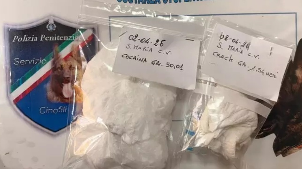 Il sequestro – L’operazione è scattata durante i controlli pre colloqui nel carcere “Uccella”, dove gli agenti, supportati dai cani antidroga A-Iron e Tyson, hanno individuato sostanze stupefacenti nascoste tra gli effetti personali dei familiari dei detenuti. Sequestrati 50 grammi di cocaina, 42 grammi di hashish e 1,50 grammi di crack. Decisivo l’intervento delle unità cinofile della Polizia penitenziaria: il fiuto dei due cani ha permesso di individuare con precisione la presenza della droga, evitando che venisse introdotta all’interno dell’istituto.