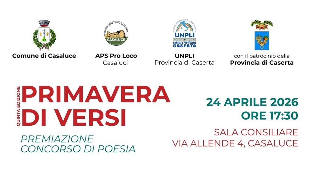 Casaluce (Caserta) – La parola poetica torna protagonista con la quinta edizione di Primavera di Versi, il concorso che negli anni ha saputo coinvolgere autori di ogni età, trasformando la scrittura in un momento di condivisione culturale. Venerdì 24 aprile, alle ore 17.30, la sala consiliare accoglierà la cerimonia di premiazione.