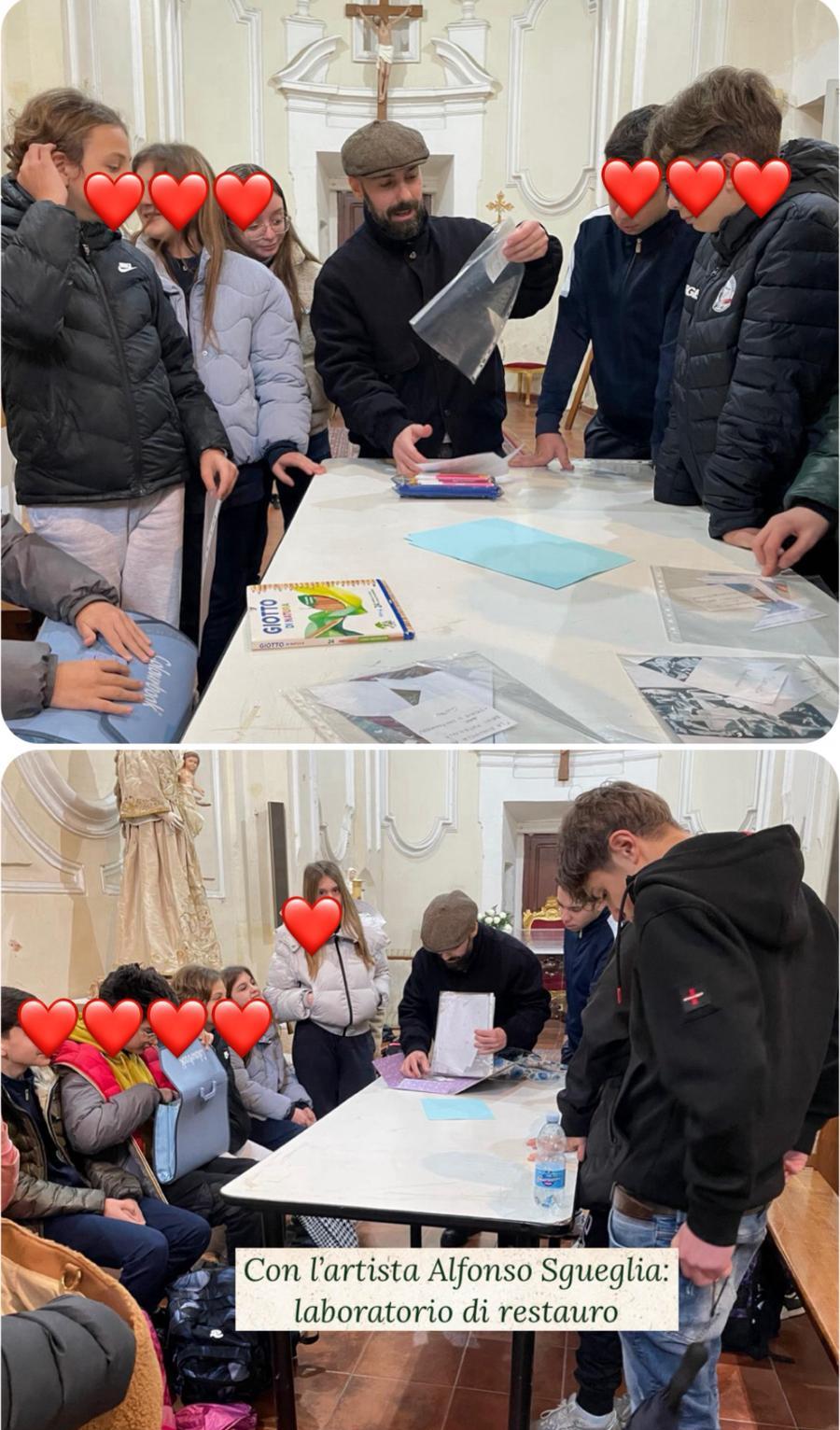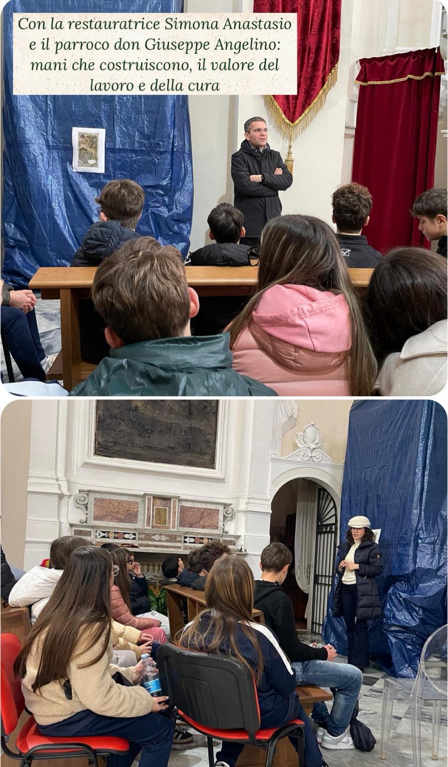 Dall’arte al restauro – Il percorso è proseguito con una visita alla parrocchia di “San Giovanni Battista” in piazza Savignano, dove don Giuseppe Angelino ha accolto gli alunni. Qui hanno assistito in anteprima al restauro di un dipinto murale a secco del XV secolo raffigurante La Pietà, curato dalla dottoressa Simona Anastasio. Successivamente, i ragazzi si sono cimentati in un laboratorio pratico insieme all’artista Alfonso Sgueglia.